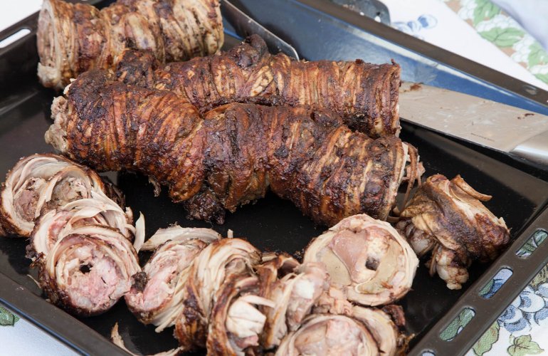 Greek Easter delicacy: oven-baked kokoretsi (lamb or goat intestines wrapped around seasoned offal).